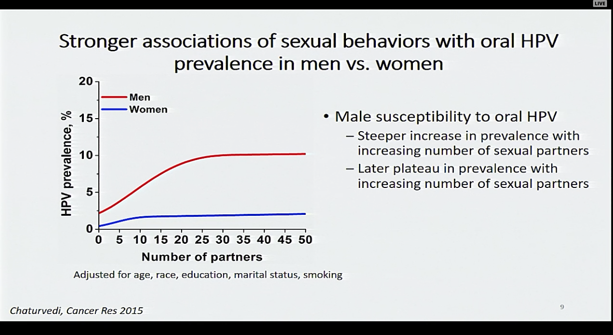 - Data suggests that there is a steeper increase in prevalence of oral cancer among males who have a higher number of sexual partners than what was observed among women.