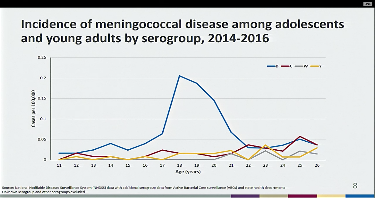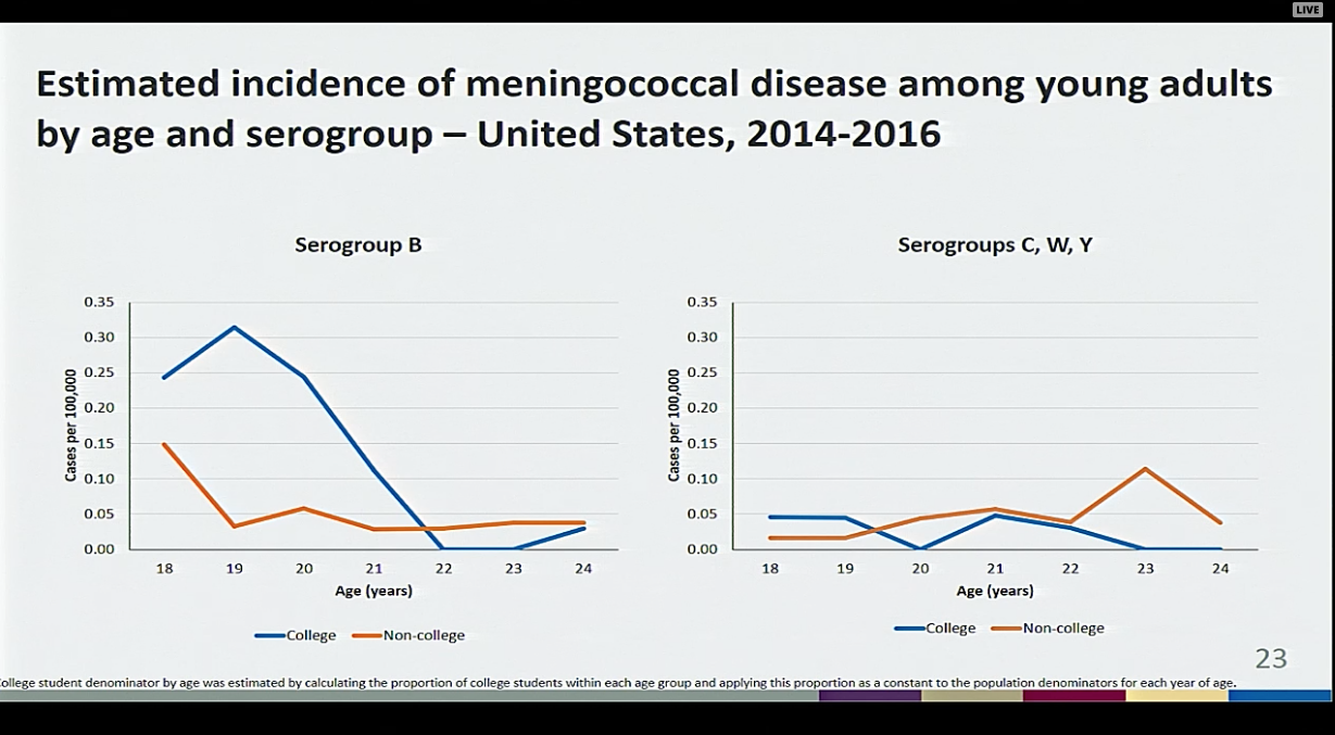 This session of the ACIP included a review of the epidemiology of meningococcal disease among college students from 2014-2016, which highlighted the following: